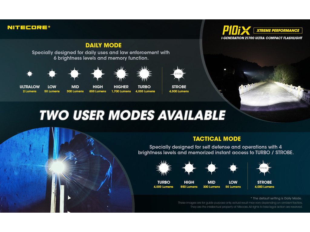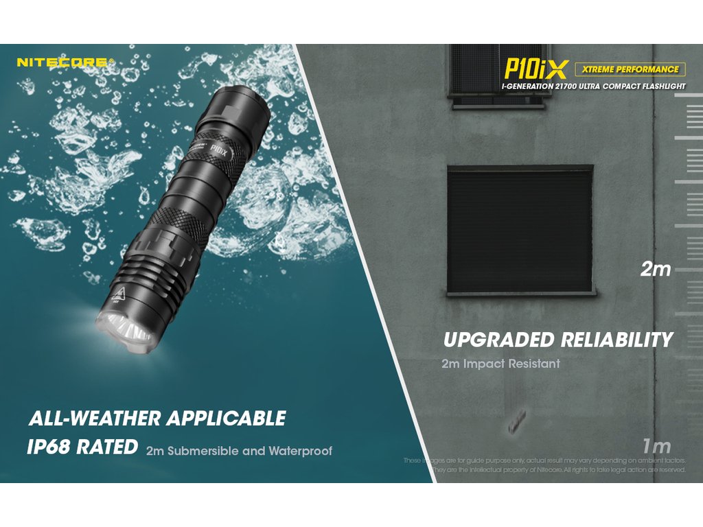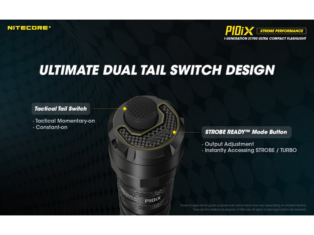 Nitecore P10iX je nová, inovovaná taktická LED svítilna nové generace, která vychází z úspěšné řady svítilen P10. Jako zdroj světla používá 4 x CREE XP-L2 V6 LED s výkonem ohromujících 4000 lumenů. Díky použité elektronice je svítilna uzpůsobena na akumulátory 21700i, nabíjené skrze svítilnu pomocí integrovaného USB-C portu. Jako zdroj energie lze použít i 2 ks baterií CR123A. Svítilna je opatřena duálním patním spínačem, který umožňuje okamžitou aktivaci stroboskopu (stroboskop má proměnlivou frekvenci pro větší účinnost proti útočníkovi). Programovatelná svítilna umožňuje možnost přednastavení svítilny ve dvou režimech. Taktický a denní. Taktický disponuje 4 intenzitami světla a stroboskopem.Denní má 6 režimů svitu a jeden speciální mód - Stroboskop. Hluboká precisní parabola vytváří široký světelný paprsek s dosvitem 158 metrů a intenzitou světelného kuželu 6 250 candela. Velice odolný úderný kroužek na hlavě svítilny s tvrzenými keramickými hroty poskytuje perfektní nástroj pro obranu nebo rozbíjení skla. Díky nově vyvinutým akumulátorům s přívlastkem "i" je navýšen výkon svítilny a není potřeba již rozlišovat polaritu, také díky speciálnímu systému proti otřesům, se již nemůže stát, že se svítilna bude samovolně vypínat. To ocení zejména střelci, kteří si svítilnu připevní pomocí montáže na zbraň. Na nejnižší řežim 2 lumeny vydří svítit až 350 hodin, takže bude věrným pomocníkem i v nouzových situacích.