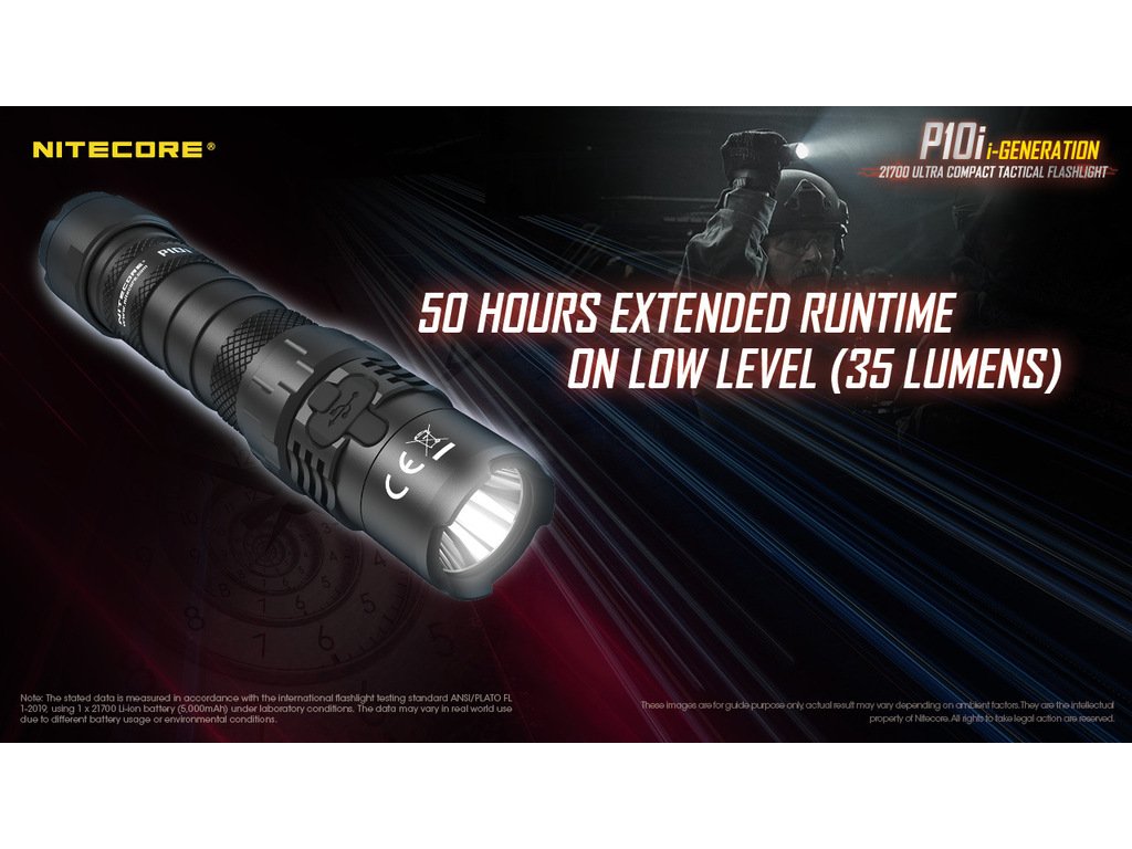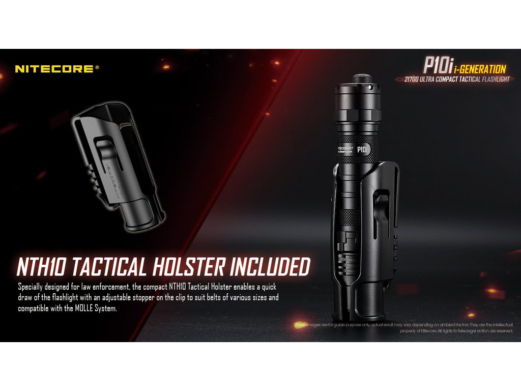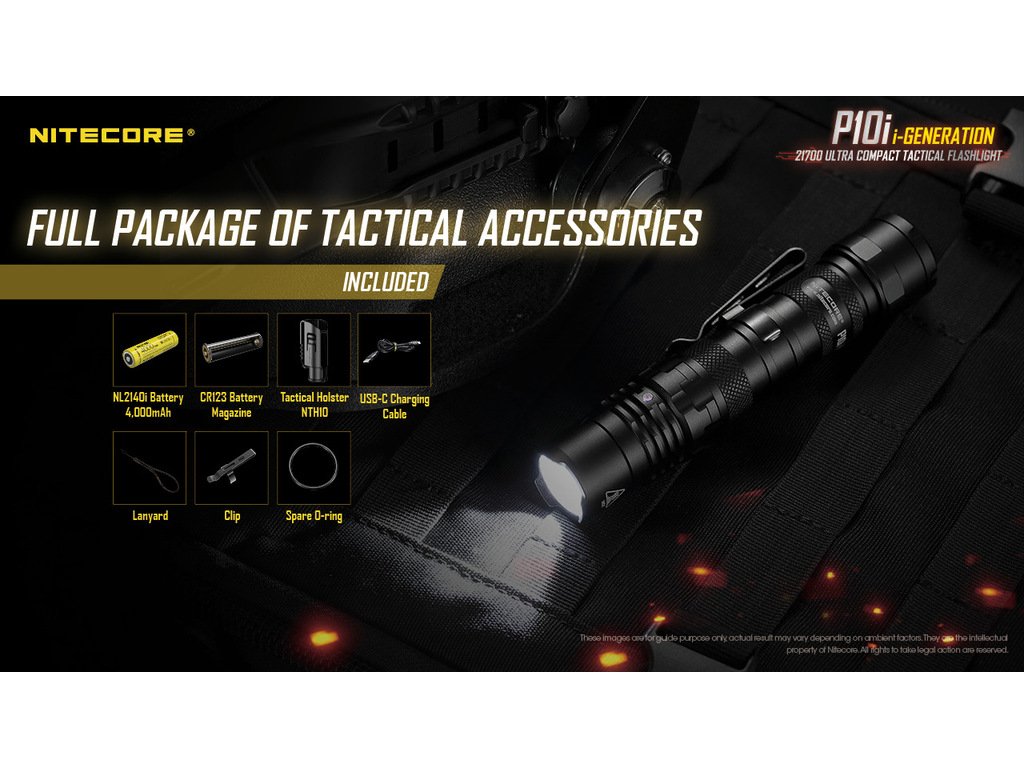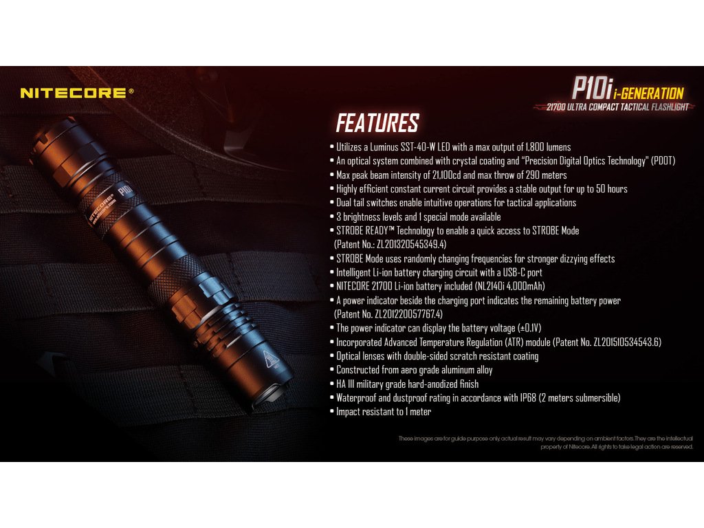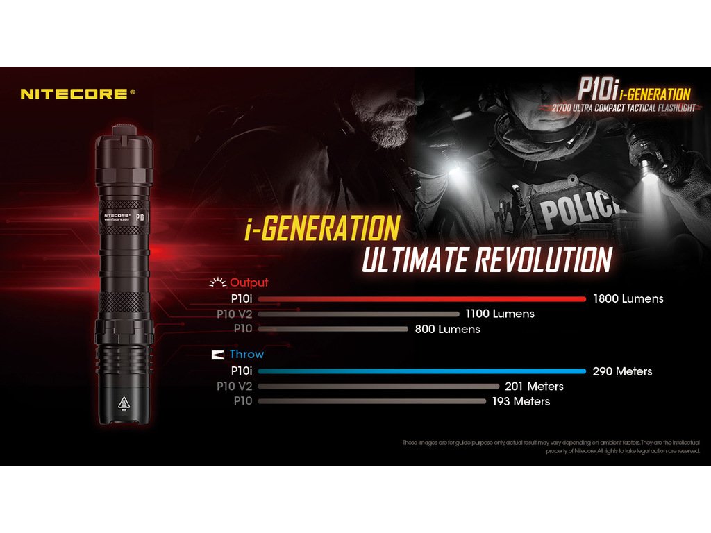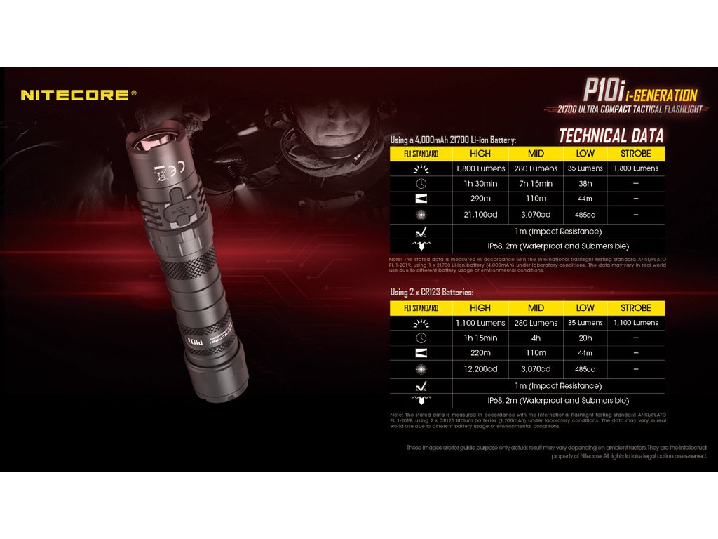 P10i je taktická LED svítilna nové generace, která vychází z úspěšné svítilny P10. Jako zdroj světla používá LED Luminus SST-40-W s výkonem max. 1800 lm. Díky použité elektronice je svítilna uzpůsobena na akumulátory 21700i, nabíjené skrze svítilnu pomocí integrovaného USB-C portu. Svítilna je opatřena duálním patním spínačem, který umožňuje okamžitou aktivaci stroboskopu (stroboskop má proměnlivou frekvenci pro větší účinnost proti útočníkovi). Hluboká precisní parabola vytváří úzký světelný paprsek s dosvitem 290 m a intenzitou 21 100 candela. Díky nově vyvinutým akumulátorům s přívlastkem "i" je navýšen výkon svítilny a není potřeba již rozlišovat polaritu, také díky speciálnímu systému proti otřesům, se již nemůže stát, že se svítilna bude samovolně vypínat. To ocení zejména střelci, kteří si svítilnu připevní pomocí montáže na zbraň. Na nejnižší řežim 35 lumenů vydří svítit až 38 hodin, takže bude věrným pomocníkem i v nouzových situacích.